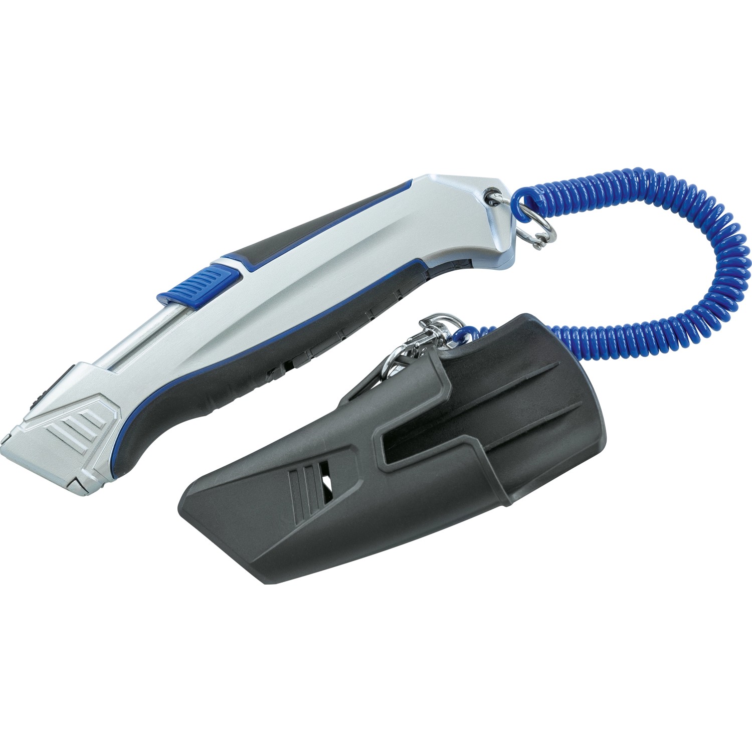 Arretierung der Klinge und komfortables Handling Das Cuttermesser verfügt über einen automatischen Arretierungsmechanismus, der das Fixieren der Klinge einfach und sicher macht. Der Austausch der Klinge erfolgt durch Drücken der Taste am Kopf des Cuttermessers. Der Griff ist mit einem einem Soft Touch ausgestattet, wodurch ein komortables Handling bei längeren Arbeiten gewährleistet wird. Zur Aufbewahrung ist im Lieferumfang eine Tasche enthalten.