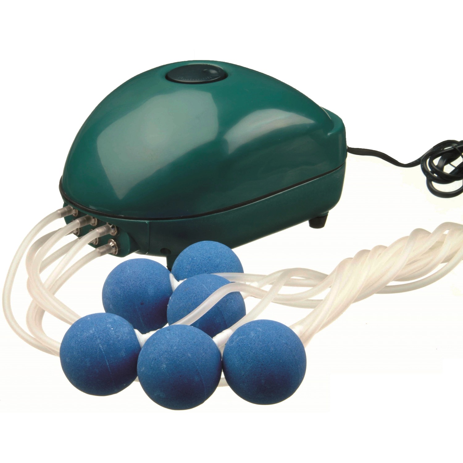 Ubbink Belüftungspumpe Air 1.000indoor 840 l/h 20 W Sauerstoff ist lebenswichtig für Flora und Fauna. Wenn es im Frühjahr plötzlich sehr warm wird oder in langen Hitzeperioden im Sommer wird der Sauerstoff im Wasser schnell knapp. Schnelle Abhilfe schaffen die Belüftungspumpen der Air-Serie. Über 6 Luftströmersteine, die jeweils durch einen Schlauch mit der Belüftungspumpe verbunden sind, wird Sauerstoff direkt in das Teichwasser oder auch direkt in einen Teichfilter abgegeben. Air Belüftungspumpen arbeiten auf Membranbasis, es gibt pro Ausgang eine Membran. Mit 6 Schläuchen und 6 Belüftersteinen.