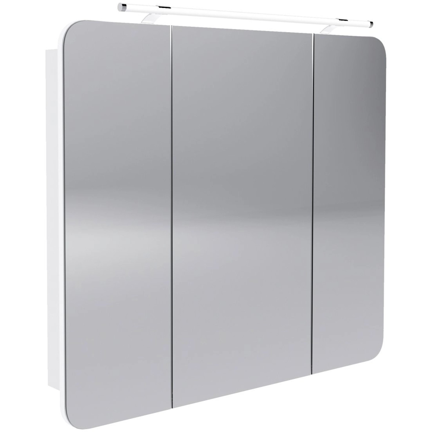 • Fackelmann Spiegelschrank, 90 cm breit, weiß, mit drei Türen und Aufsatzleuchte.