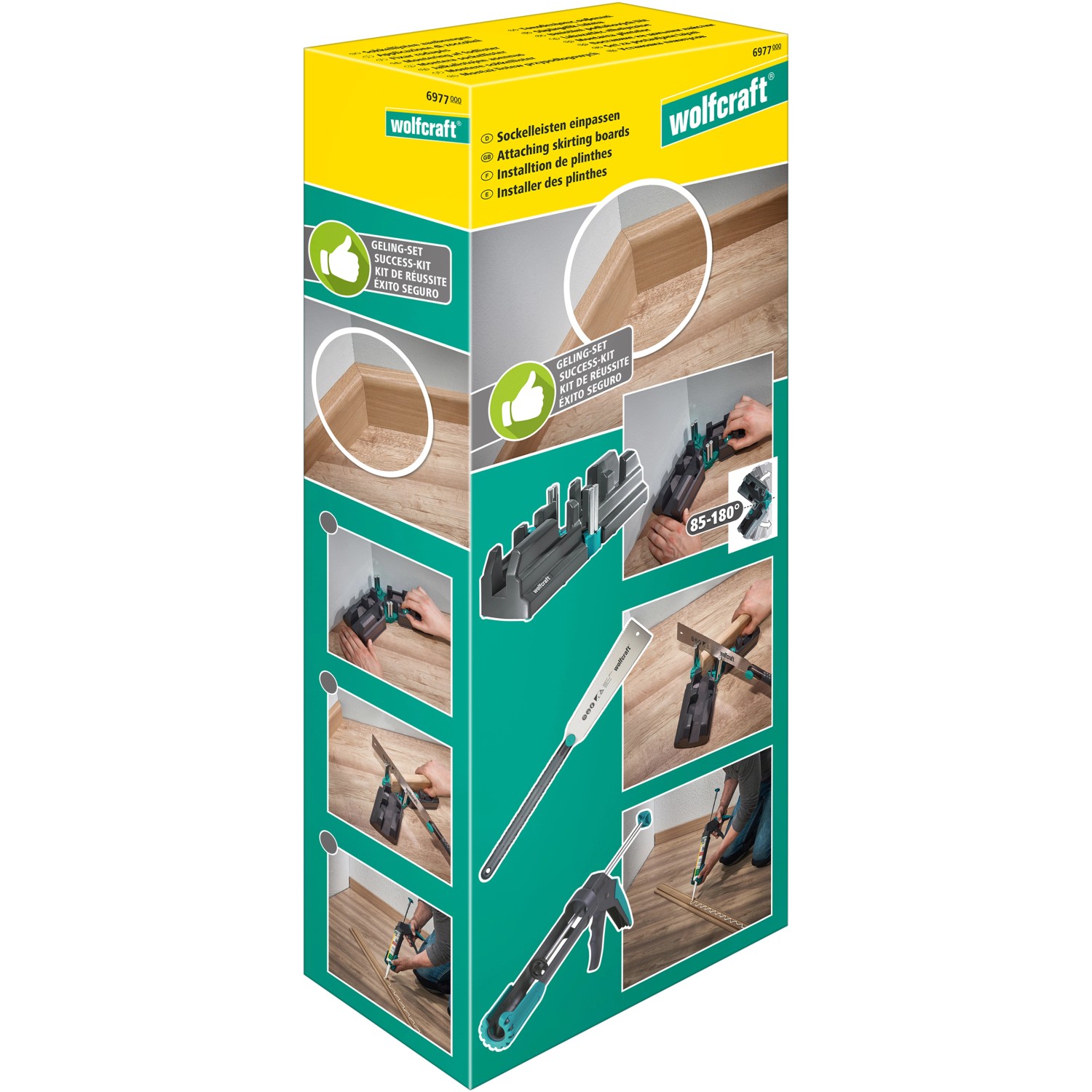 Das praktische Montage-Set für Sockelleisten von wolfcraft enthält alles, was Sie für das exakte Ausmessen, Zuschneiden und Befestigen von Sockelleisten benötigen. Enthalten sind die Schmiege und Schneidlade, die Japansäge und die Kartuschenpresse MG 200.