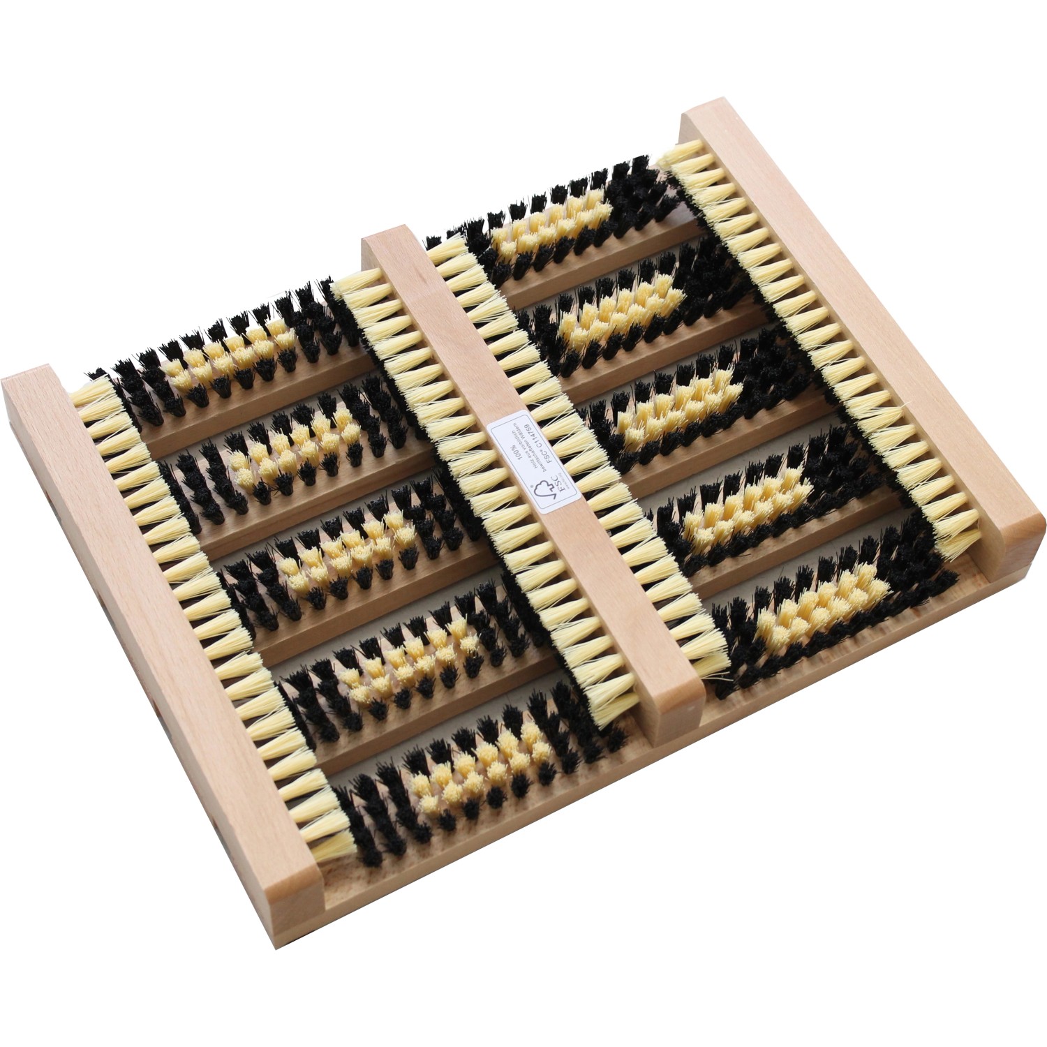 Kräftige Kunstborsten mit Seitenleisten Die robusten Kunststoffborsten, welche im stabilen Hartholz verankert sind, reinigen Ihre Schuhe unterhalb und seitlich durch einfache Vor und Zurückbewegungen Ihrer Füße. Kräftige Kunstborsten, trittsicher und wetterbeständig zeichnen diesen Schuhreiniger aus. Abgerundet wird das Ganze mit stabilen Seitenleisten, sowie einer Streifengummiunterlage. Durch die auf der Unterseite angebrachten Gummiunterlage bleibt dieser Fussabstreifer auch auf glatten und nassen Böden stabil liegen und sorgt für einen besseren Halt.