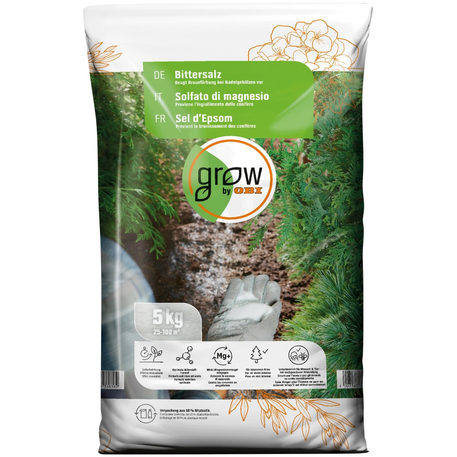 Das GROW by OBI Bittersalz ist ein hochwirksamer Magnesiumdünger mit Sofortwirkung. Er beugt einer Braunfärbung an Nadelgehölzen vor.