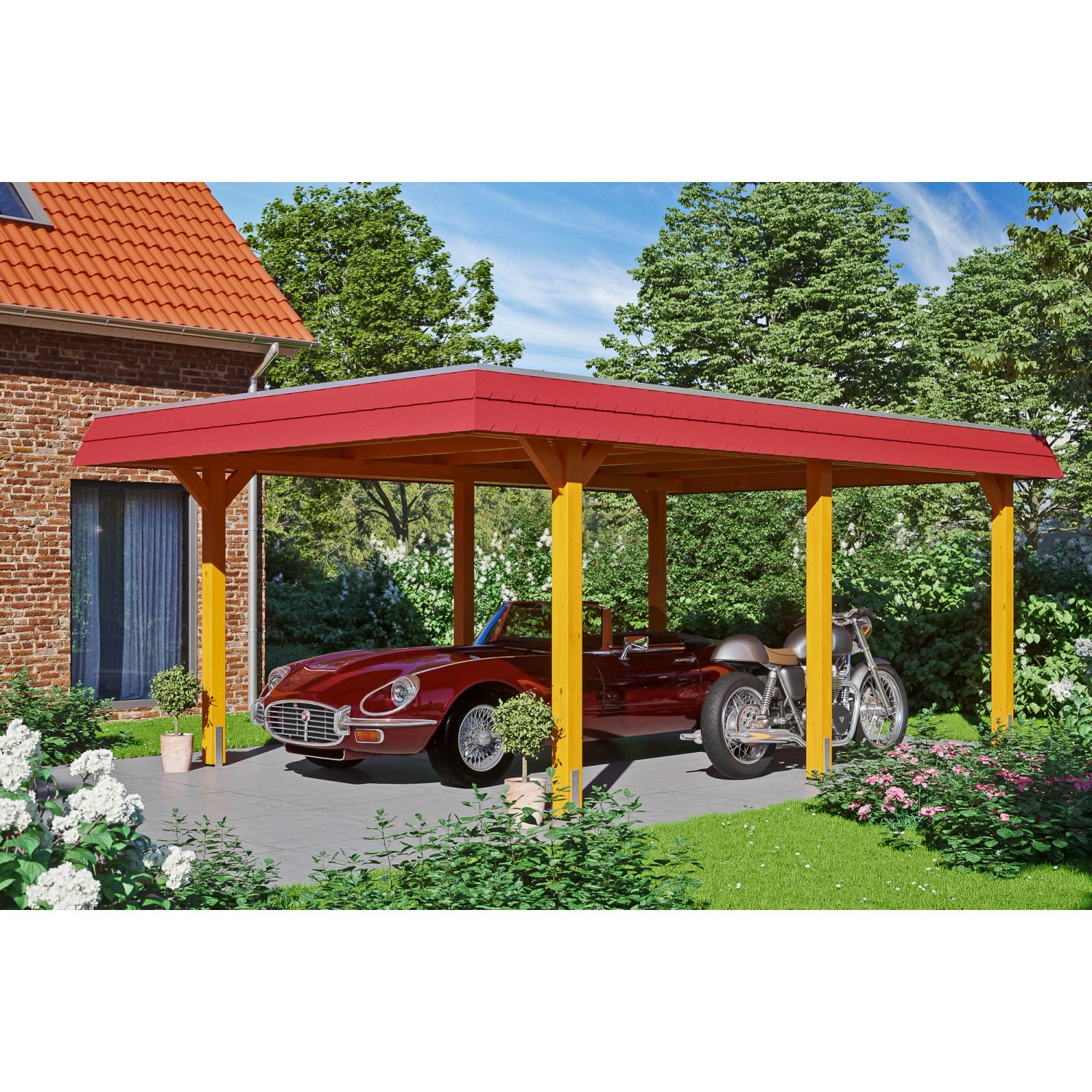 Skan Holz Carport Wendland Eiche hell 409 x 628 cm Alu-Dach Blende Rot