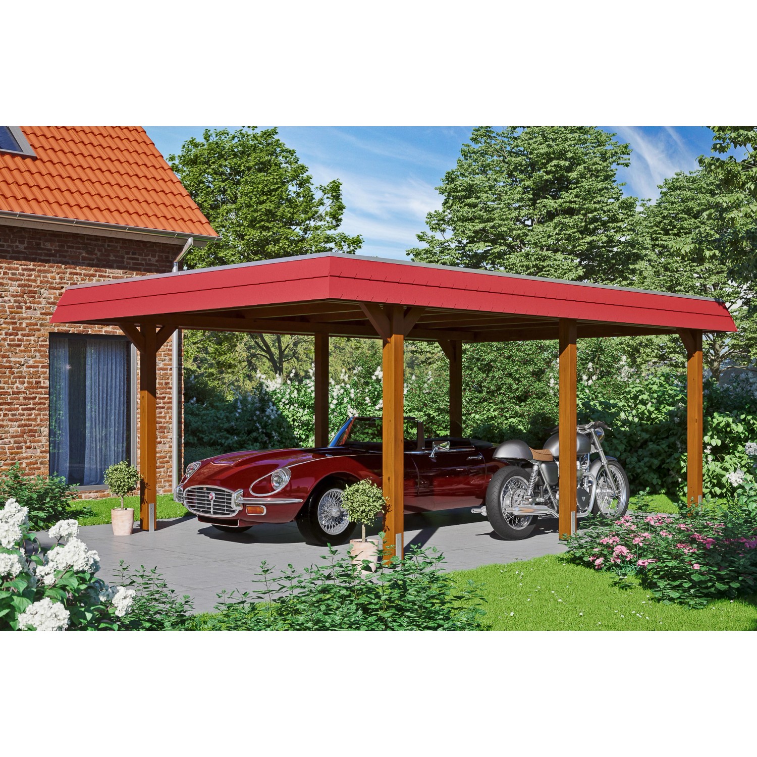 Skan Holz Carport Wendland Nussbaum 409 x 628 cm Alu-Dach Blende Rot