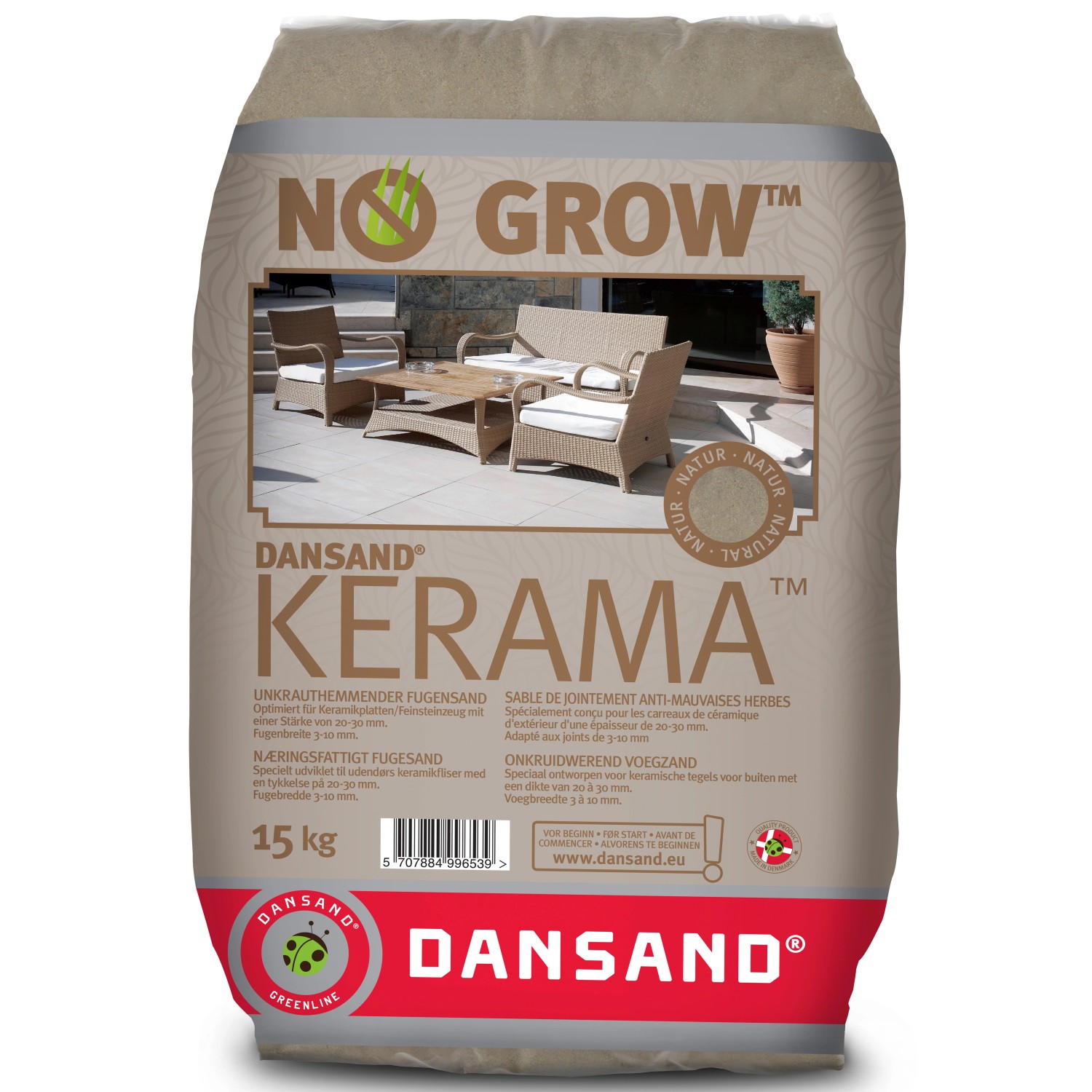 Dansand Kerama wurde für die Verfugung von Feinsteinzeug und keramischen Platten entwickelt. Da keramische Platten und Feinsteinzeug meist nur eine Stärke von 20-30 mm haben, lässt sich das Fugenmaterial relativ schnell auswaschen und verliert somit seine Funktion. Die Lösung heißt No Grow Dansand Kerama. Der natürlich hohe pH-Wert des Fugenmaterials lässt Samen austrocknen, die sich in Folge nicht ansiedeln und keimen können. Die beigefügten Bindemittel sorgen für stabile und doch elastische Fugen, die zugleich außerordentlich widerstandsfähig gegen Schlagregen und Oberflächenwasser sind. So werden ungünstige Wachstumsbedingungen geschaffen und Unkraut nachhaltig ferngehalten. Erhältlich in drei edlen Farben Natur, Grau und Anthrazit, passt Dansand Kerama zu dunklen sowohl als auch zu hellen Platten.