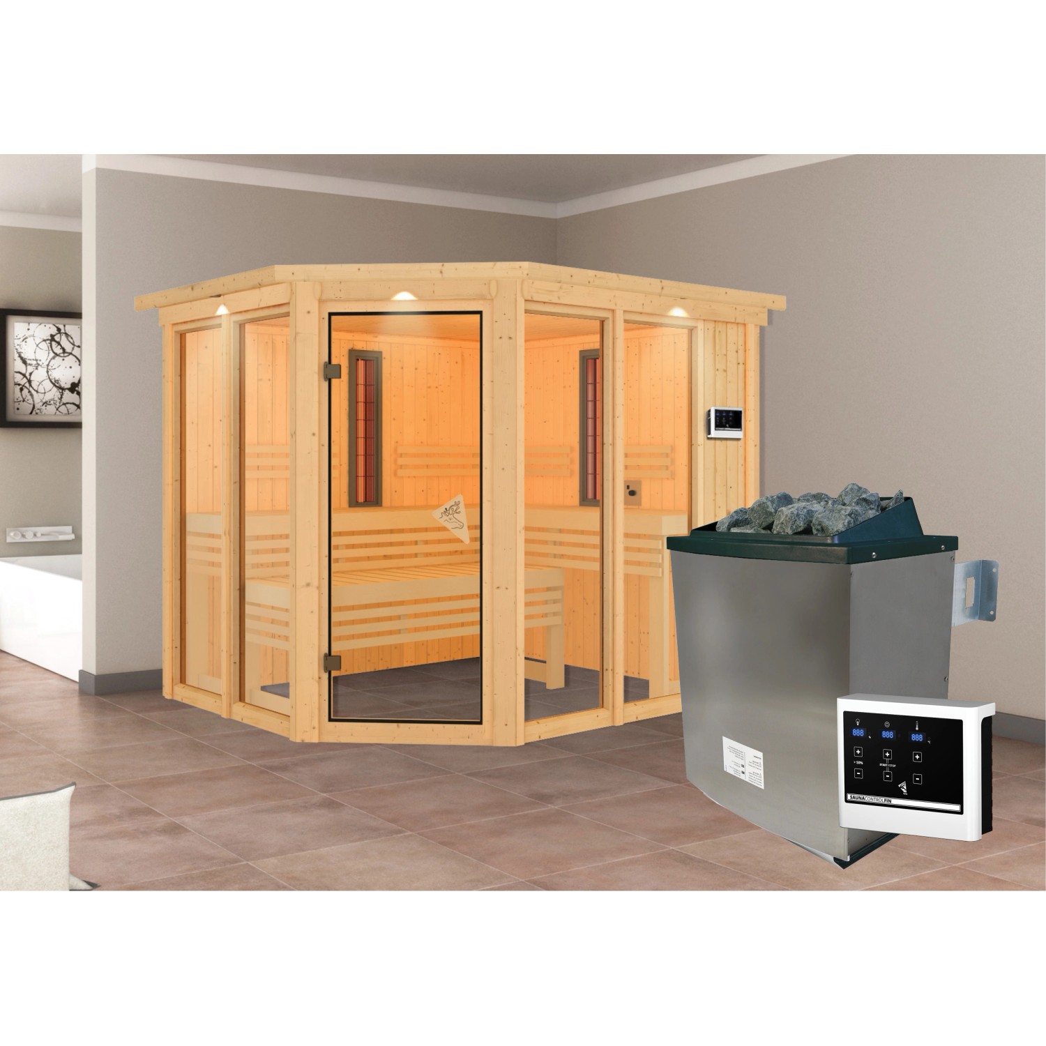 Im Lieferumfang enthalten ist ein umfangreiches Zubehör, so dass Sie Ihre Sauna sofort genießen können. Sie erhalten einen 9 kW Saunaofen mit externer Steuerung, so dass Sie die Temperatur an Ihre Bedürfnisse anpassen können. Zusätzlich sind zwei 500 Watt IR-Vitalightstrahler eingebaut, die beide stufenlos durch ein Steuergerät in der Kabine regulierbar sind. Außerdem erhalten Sie zum Ofen ein passendes Ofenschutzgitter.