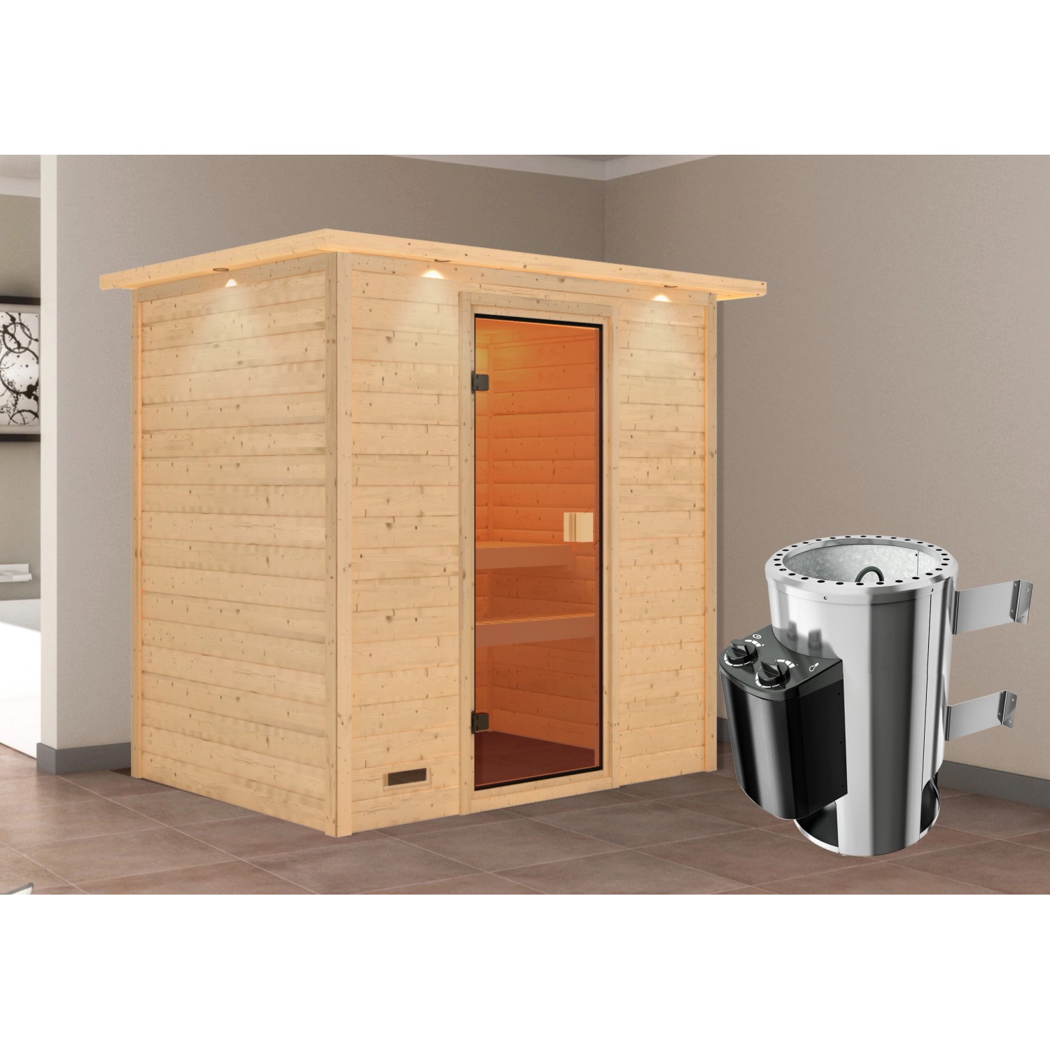 Die Karibu Massivholzsauna Selena mit Fronteinstieg inkl. 3,6 kW Saunaofen mit integrierter Steuerung, Dachkranz und den dazugehörigen LED-Strahlern, bronzierter Ganzglastür und weiterem Zubehör eignet sich ideal um in niedrigen Räumen zu Hause die wohlige Wärme einer Sauna zu genießen.